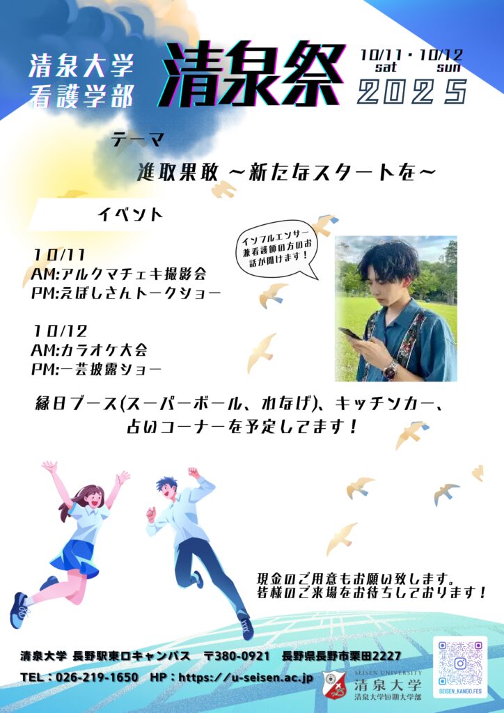 10月11日(土) 長野県・清泉大学紹介withアルクマ・・・長野県と清泉大学を清泉生が紹介をします!アルクマとの交流時間もあるよ。※希望者には撮影したチェキをプレゼント! えぼしさんトークショー・・・インフルエンサー兼看護師の方のお話が聞けます!