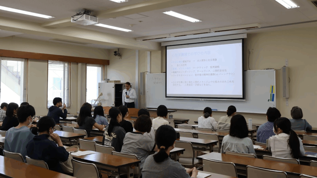 はじめに、北村英哉教授から「ビジネスにおける心理学の活用」という講義がありました。仕事のモチベーションやリーダーシップなど、「働く」ということについて様々な観点から解説されました。