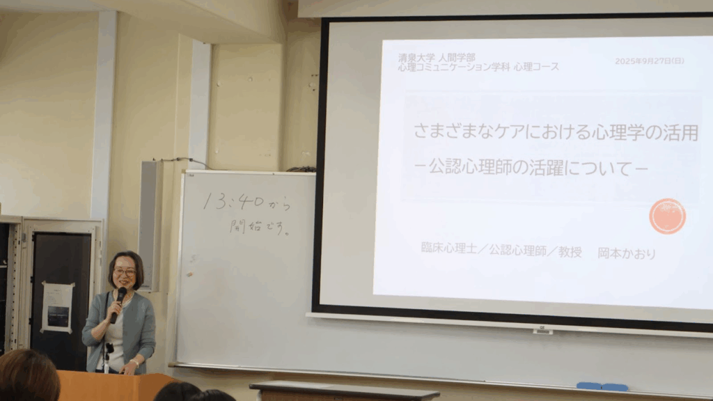 次に、岡本かおり教授による講義「さまざまなケアにおける心理学の活用」が行われました。公認心理師によるケアについて、先生のご経験や実際の支援についてたくさんのお話をいただきました。