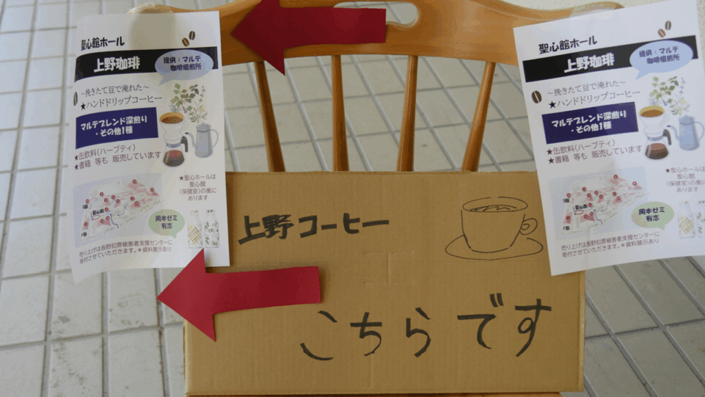 また、学生がドリップした美味しい珈琲などを楽しめる『上野珈琲』が大盛況でした。ここでは、犯罪被害者への心理支援などのポスターが展示され書籍を購入できるコーナーもあり、専門的な知見に触れることができました。なお、『上野珈琲』の売り上げは長野犯罪被害者支援センターに寄付いたします。