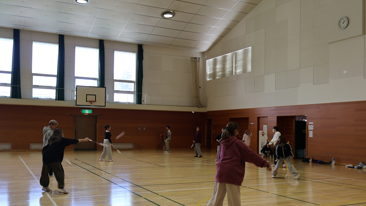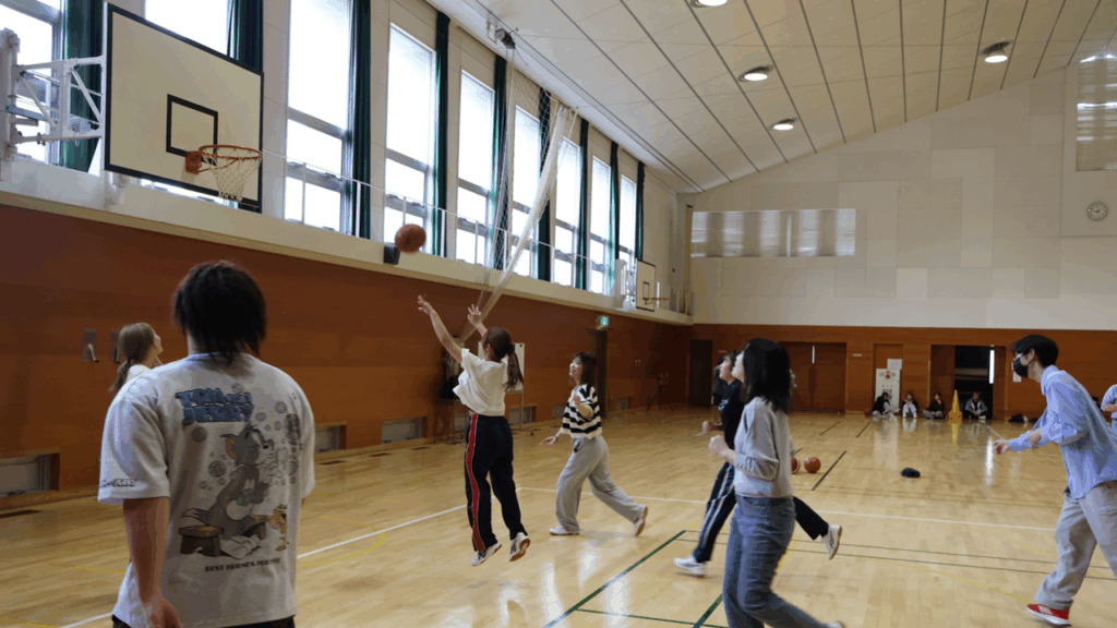 スポーツ企画では、バドミントンとバスケットボールを行いました。バスケットボールでは、男女混合のチームを作り、総当たり戦で試合を楽しみました。