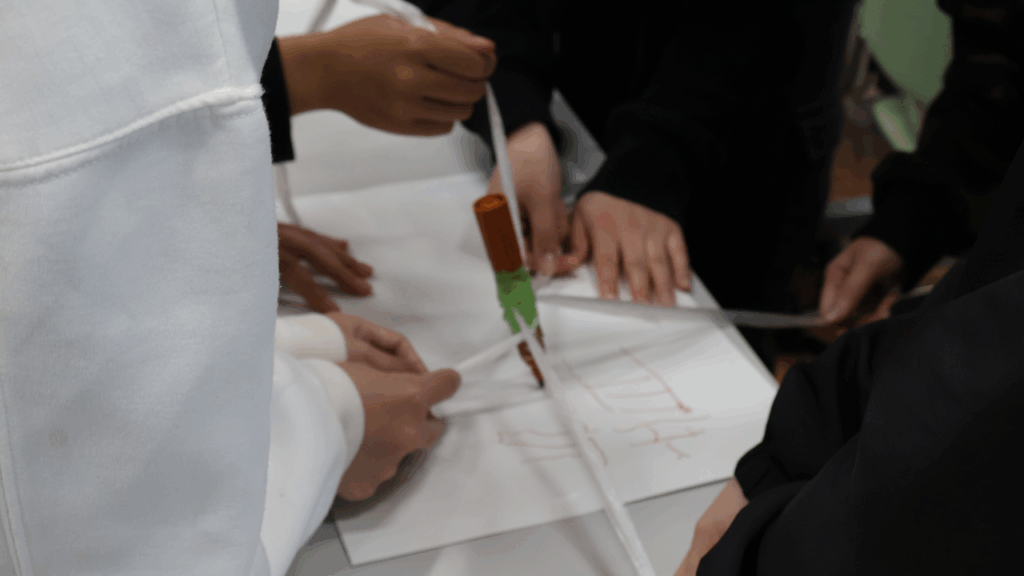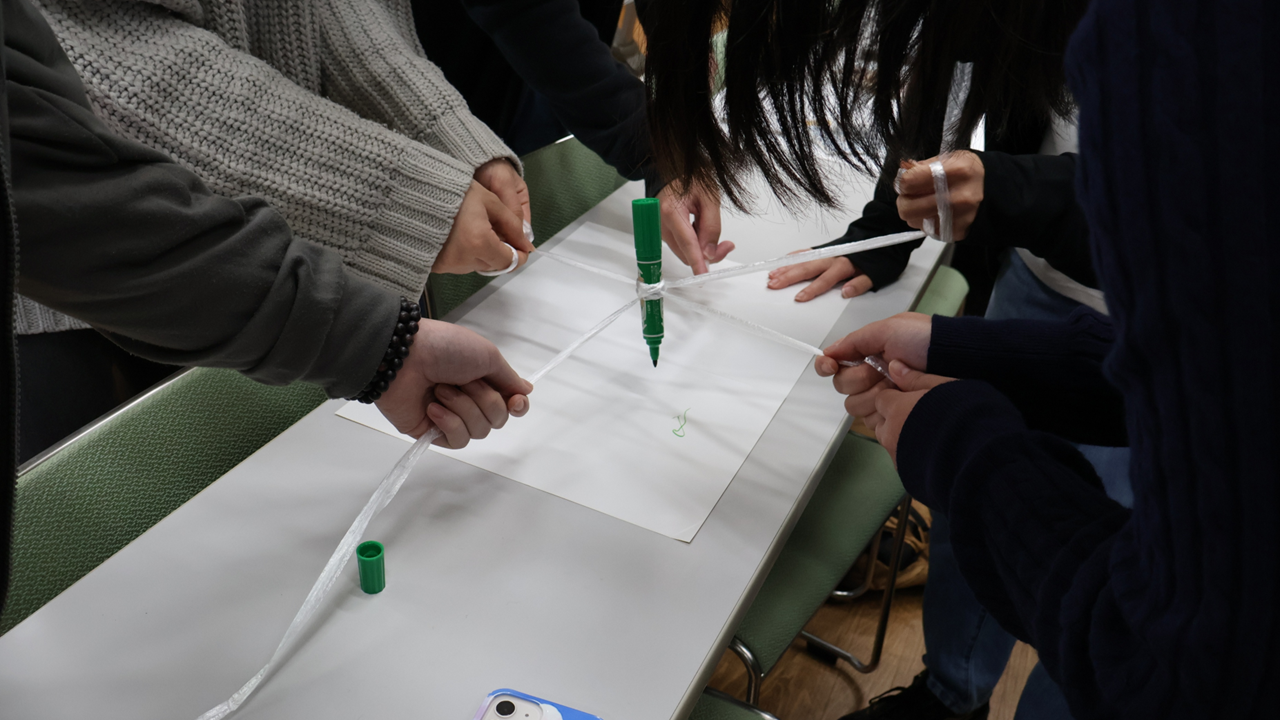 レクリエーション企画では、4人一組のグループを作り、有名な曲のイントロを当てるクイズ、ペンに括りつけた紐を四方から持ってお題の漢字を協力して書くゲーム、ストローとセロハンテープを使ってなるべく高いタワーを作るゲームを行いました。