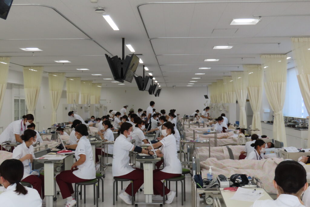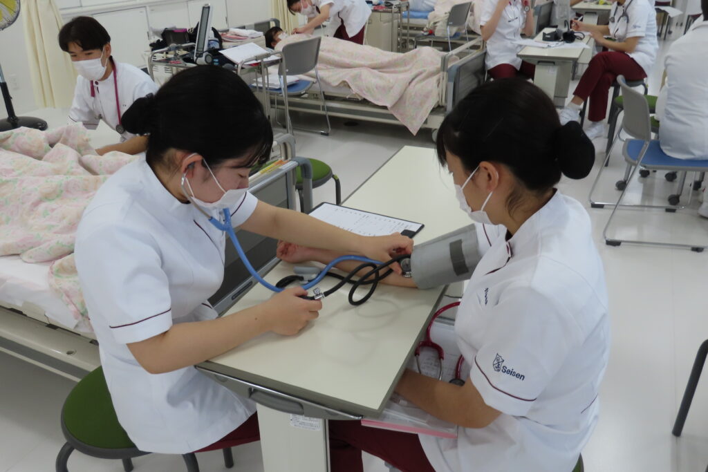 看護の視点から対象者の身体的・心理的・社会的な健康状態をアセスメントする方法を理解する「ヘルスアセスメント」の授業でバイタルサイン測定を行いました。 初めての血圧測定を緊張の中慎重に行いました。