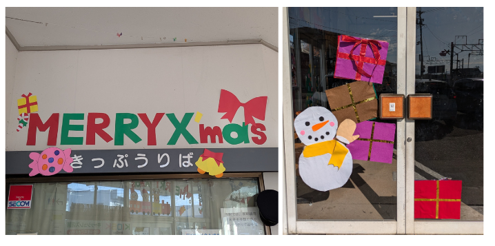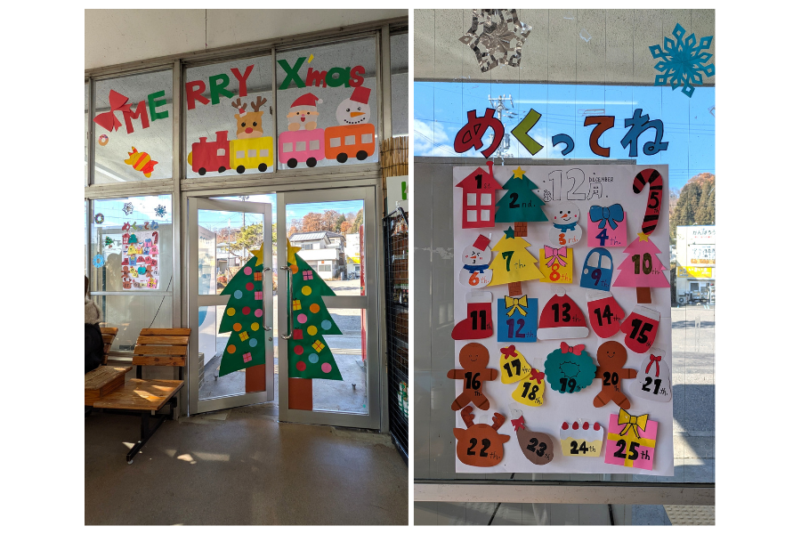 12月の装飾テーマは「クリスマス」です。クリスマスの雰囲気を楽しんでいただけるように、素材の選び方や制作方法を工夫し、さまざまなモチーフを制作しました。アドベントカレンダーも飾ってあるので、日付のカードをめくって毎日のメッセージをお楽しみください♪