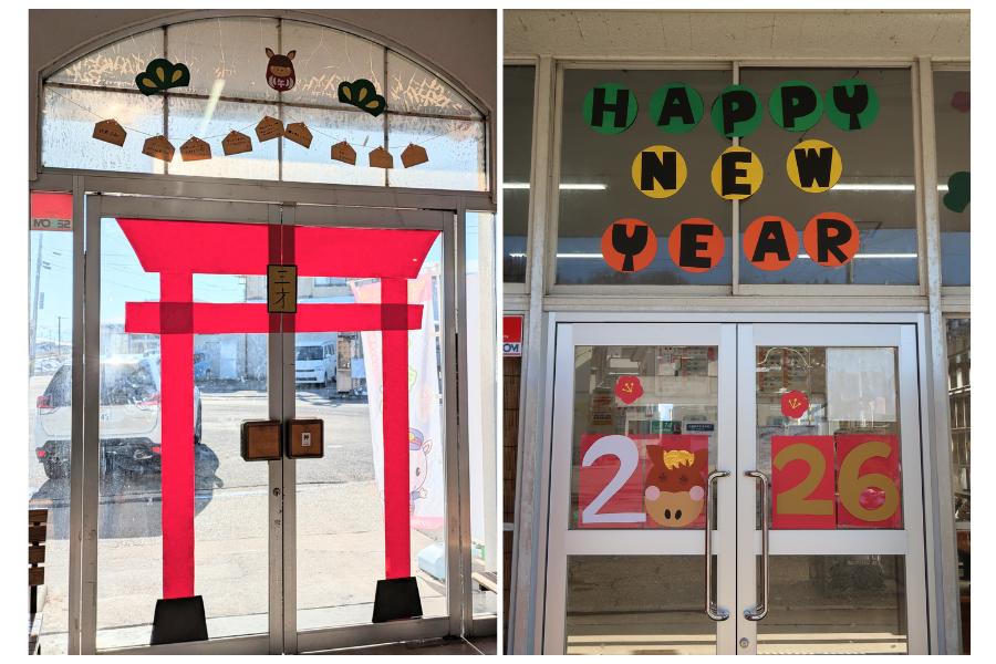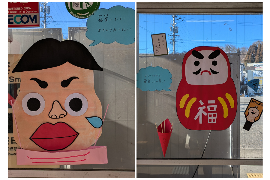 1月の装飾テーマは「お正月」です。新年のおめでたい雰囲気を演出できるように、デザインを検討し、さまざまなモチーフを制作しました。手作りのおみくじをぜひ引いてみてください!福笑いも飾ってあるので、電車の待ち時間などに遊んで楽しんでもらえたらと思います♪