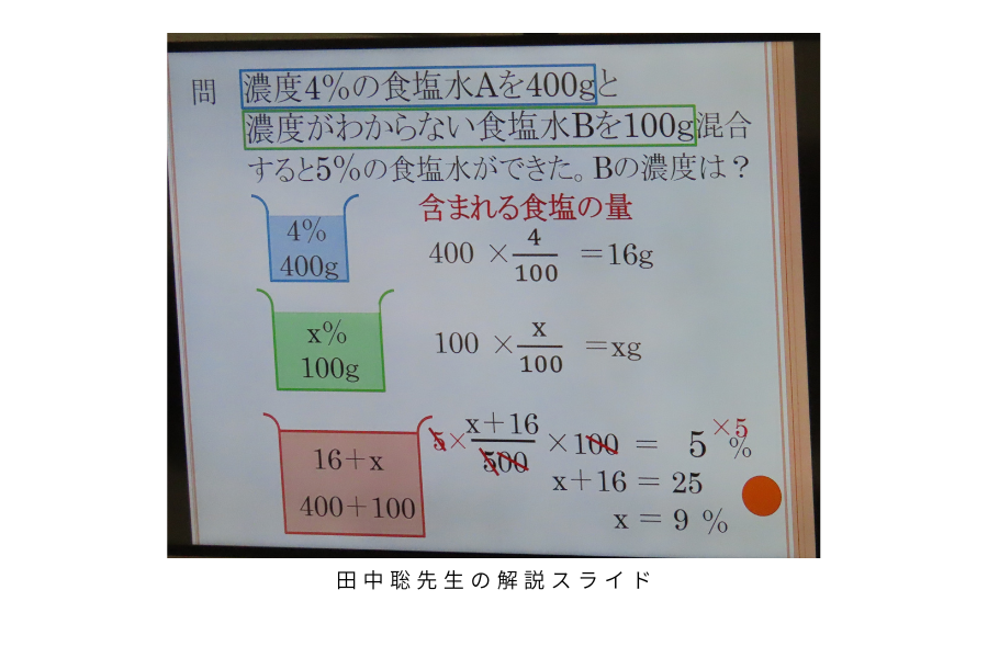 【問題】「濃度4%の食塩水Aを400gと、濃度のわからない食塩水Bを100g混合すると、5%の食塩水ができた。Bの濃度は?」※答えは最後に紹介します。