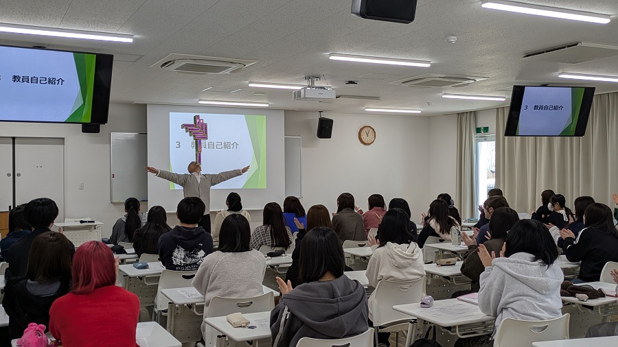 初回の授業では、専任教員による自己紹介を行いました。個性あふれる先生方の紹介に、教室も和やかな雰囲気に包まれました。
