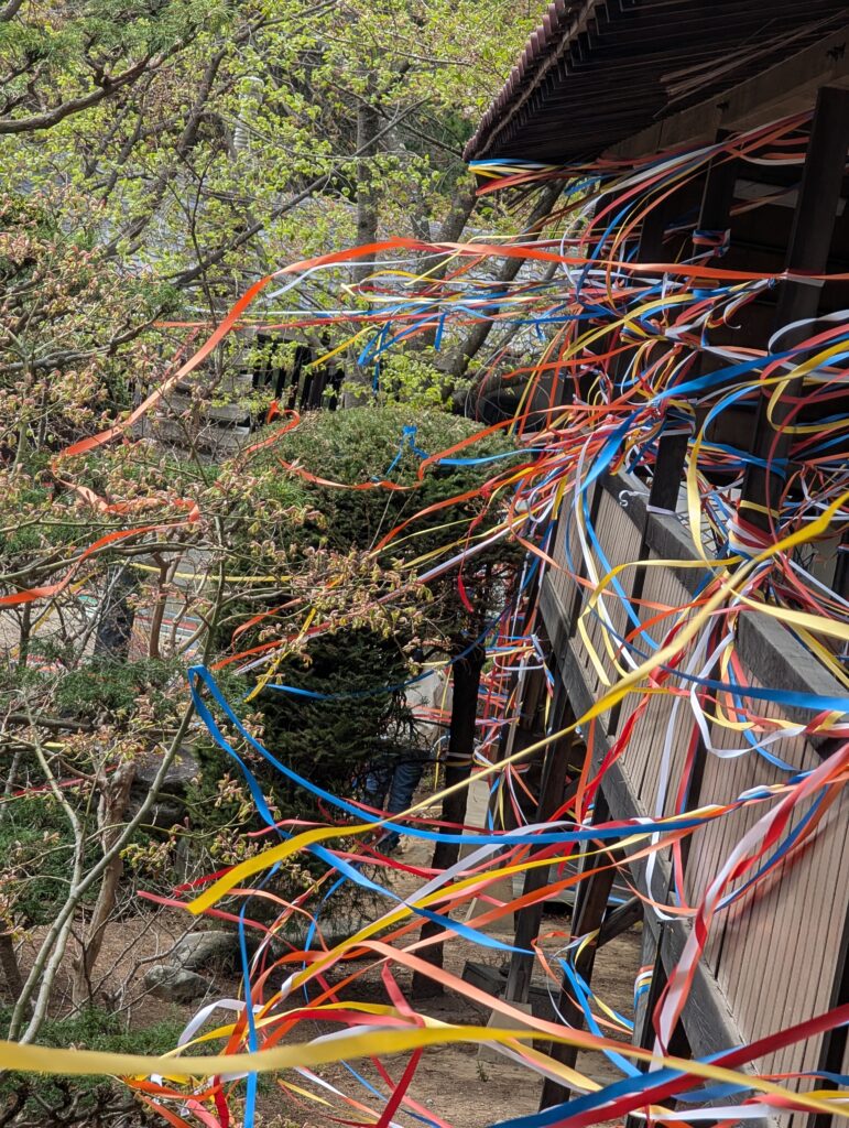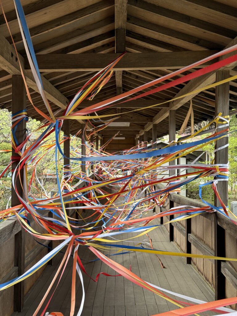 その5色の紙テープを空中回廊を中心に歴史ある境内空間にリアルタイムで広げていくものです。