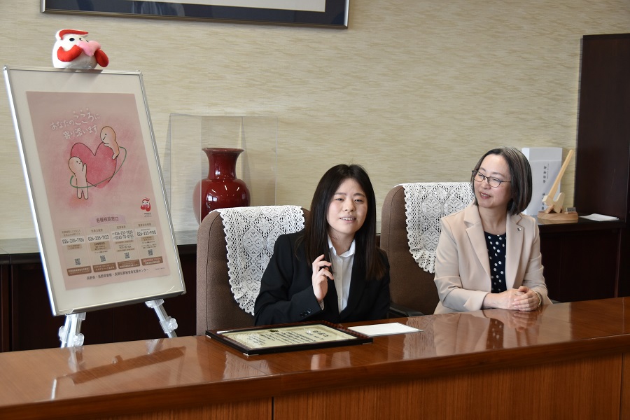 人間学部心理コミュニケーション学科「カウンセリング実務演習」の授業では、相談を受ける際の話の聴き方を学びます。今年度はその一貫として、県警被害者支援室から、被害者が利用できる相談窓口が周知されていないこと、被害をなかなか相談できない人が少なくないことを伺い、授業課題として、相談窓口の周知と相談の敷居を低くするためのポスター制作をお手伝いさせていただくことになりました。学生が作成した37作品から、県民に訴えかけるポスターとして適しているものとして、小野塚さんの案が採用され、先日、県警の長瀬悠警務部長から感謝状が手渡されました(写真:新聞2社からインタビューを受ける小野塚さんと授業担当の岡本教授)。
