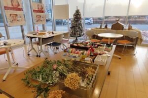 材料を選ぶところから工夫を凝らし、色合いや配置を考えながら、一つひとつ丁寧に作り上げる姿が印象的でした。参加者同士でアイデアを共有したり、スタッフと会話を交わしたりしながら、それぞれのペースで制作に取り組まれていました。短い制作時間の中でも、完成したリースは一つひとつに個性が光り、参加者それぞれの思いが感じられ、見ているこちらまで笑顔になるような素敵な作品ばかりでした。