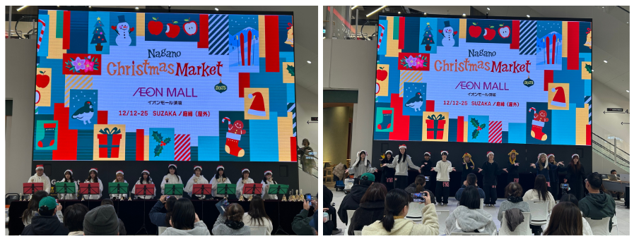 12月12日(金)には、サテライト会場のイオンモール須坂で幼児教育科山﨑卒研セミナーのハンドベルチーム「カンパネラ」による演奏と中村卒研セミナー・ダンスサークルによるパフォーマンスを行い、クリスマスの雰囲気を盛り上げました。